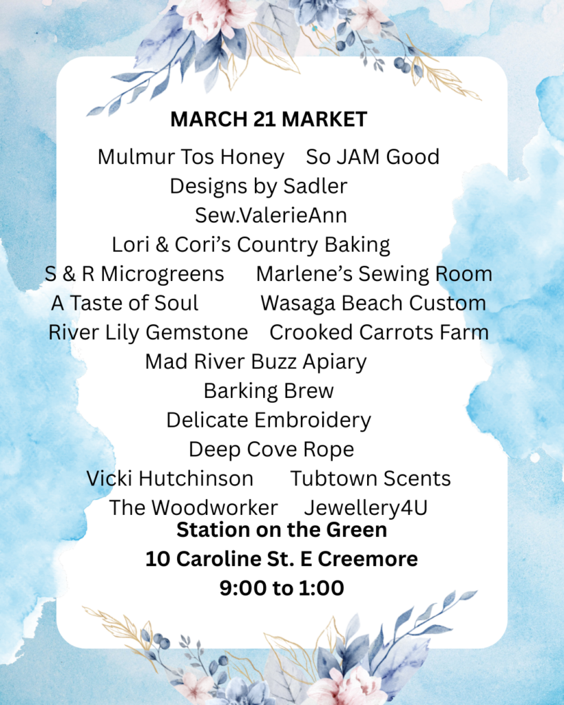 March 21admin_marketmanagerFebruary 23, 2026Updates Our next indoor market at the Station on the Green in Creemore, is Saturday, March 21 from 9:00 until 1:00.