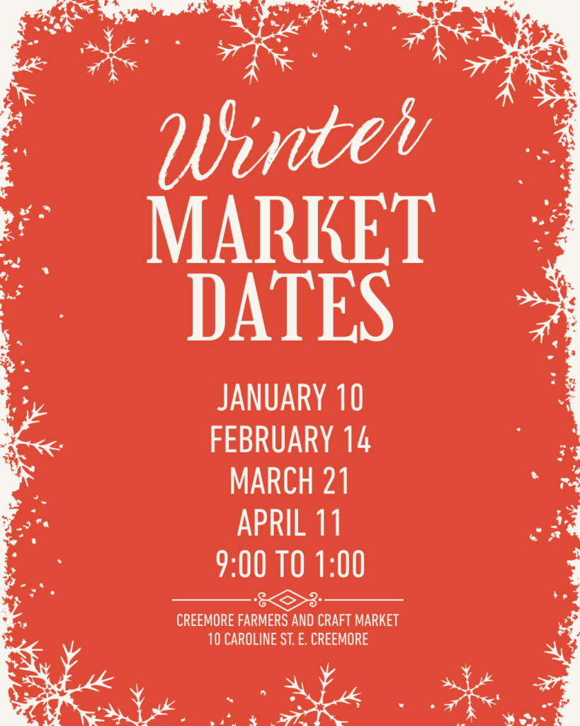 Winter Markets 2026admin_marketmanagerFebruary 3, 2026Market Updates Indoors at the Station on the Green, 10 Caroline St. E. Creemore, 9:00 to 1:00, once per month